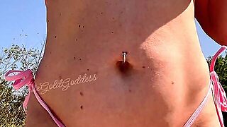 A thick MILF oiled up in a micro bikini and big ol milky boobs!